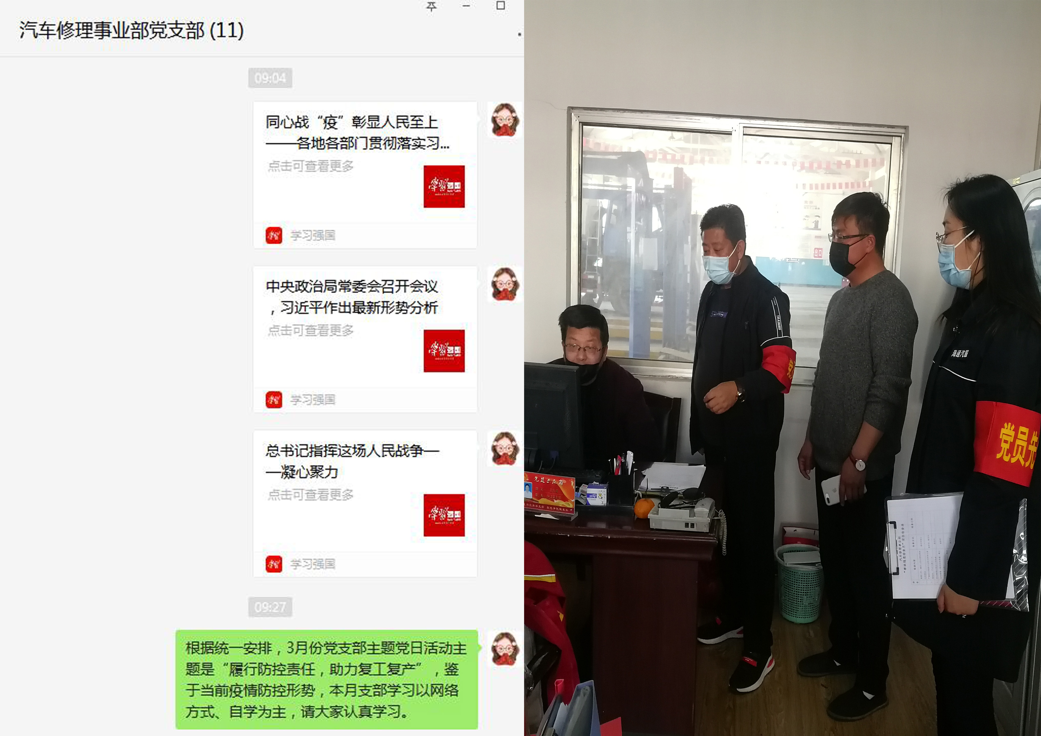 为充分引导广大党员冲锋在前,争当疫情防控和复工复产的宣传员、服务员、战斗员,让党旗飘在一线、堡垒筑在一线、党员冲在一线,3月19日,汽车修理事业部党支部开展“履行防控责任,助力复工复产”主题党日线上活动。