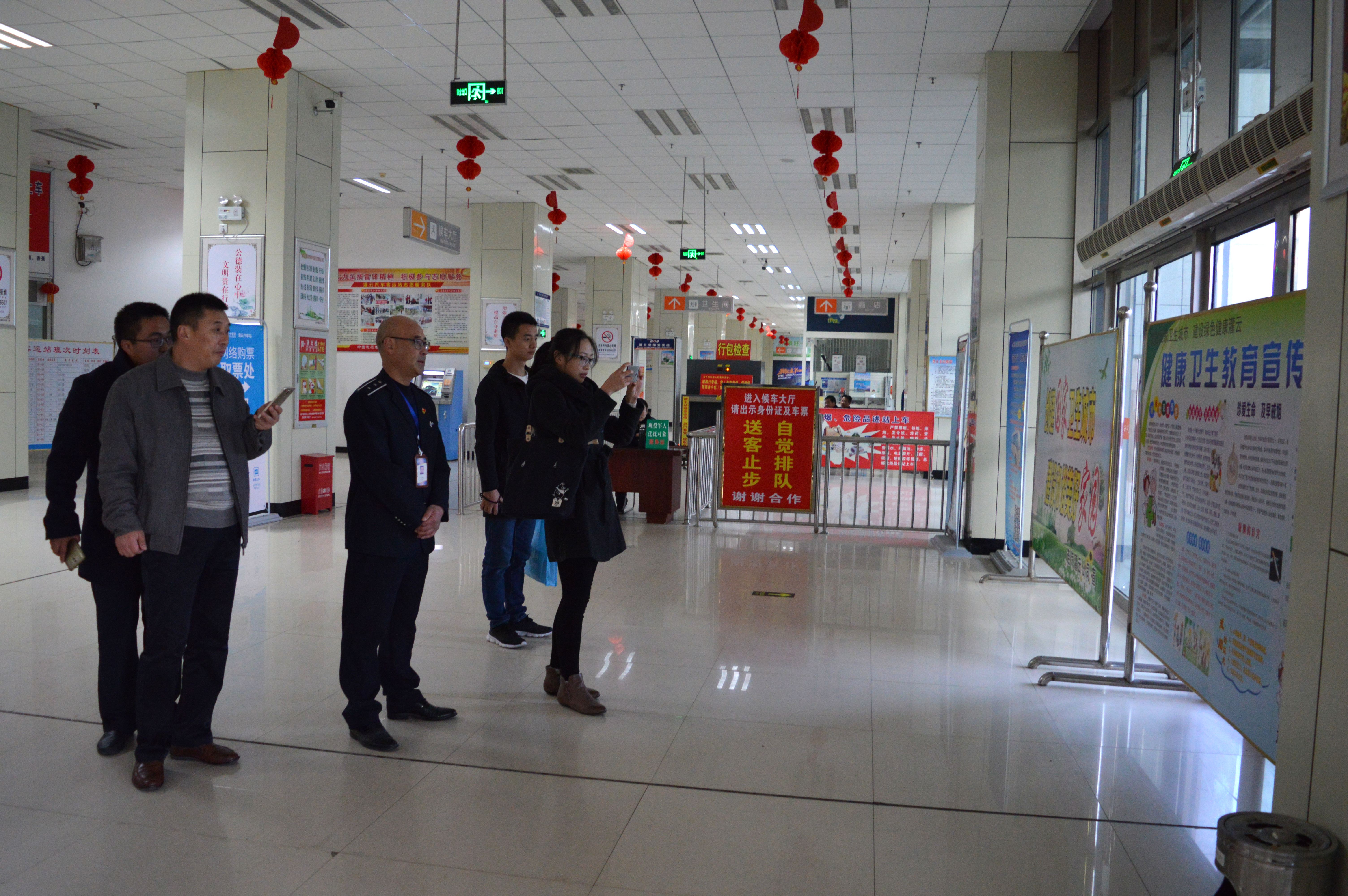 省检查组一行来到灌云客运站,查看了候车室、站内外广场绿化带、卫生间等场地的卫生状况及客运站创卫氛围,着重检查了卫生保洁制度、禁烟控烟工作落实情况,并听取了灌云客运站创国卫工作情况汇报。