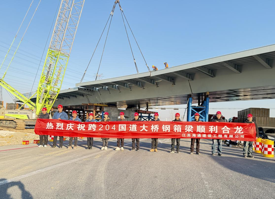 瀛洲南路改造及南延工程(一期)项目跨G204桥梁钢箱梁吊装顺利合龙