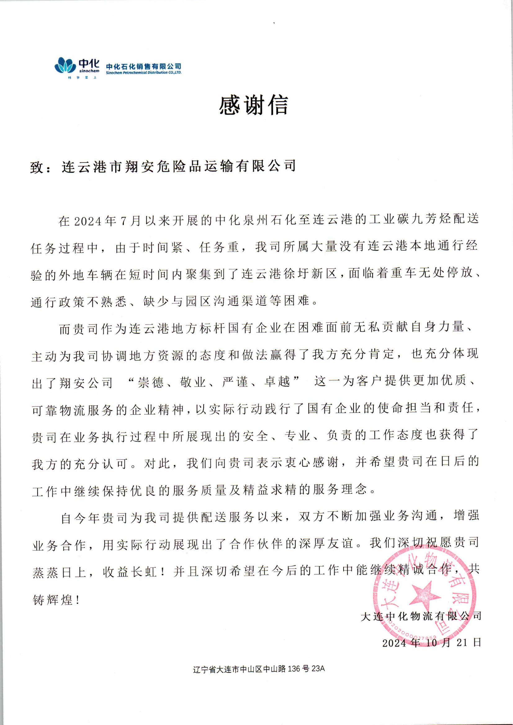10月28日,连汽翔安危险品运输有限公司收到了大连中化物流有限公司的一封感谢信。信中对翔安公司为大连中化物流有限公司在连云港业务的顺利开展所提供的支持和服务表示了由衷的赞赏和感谢。