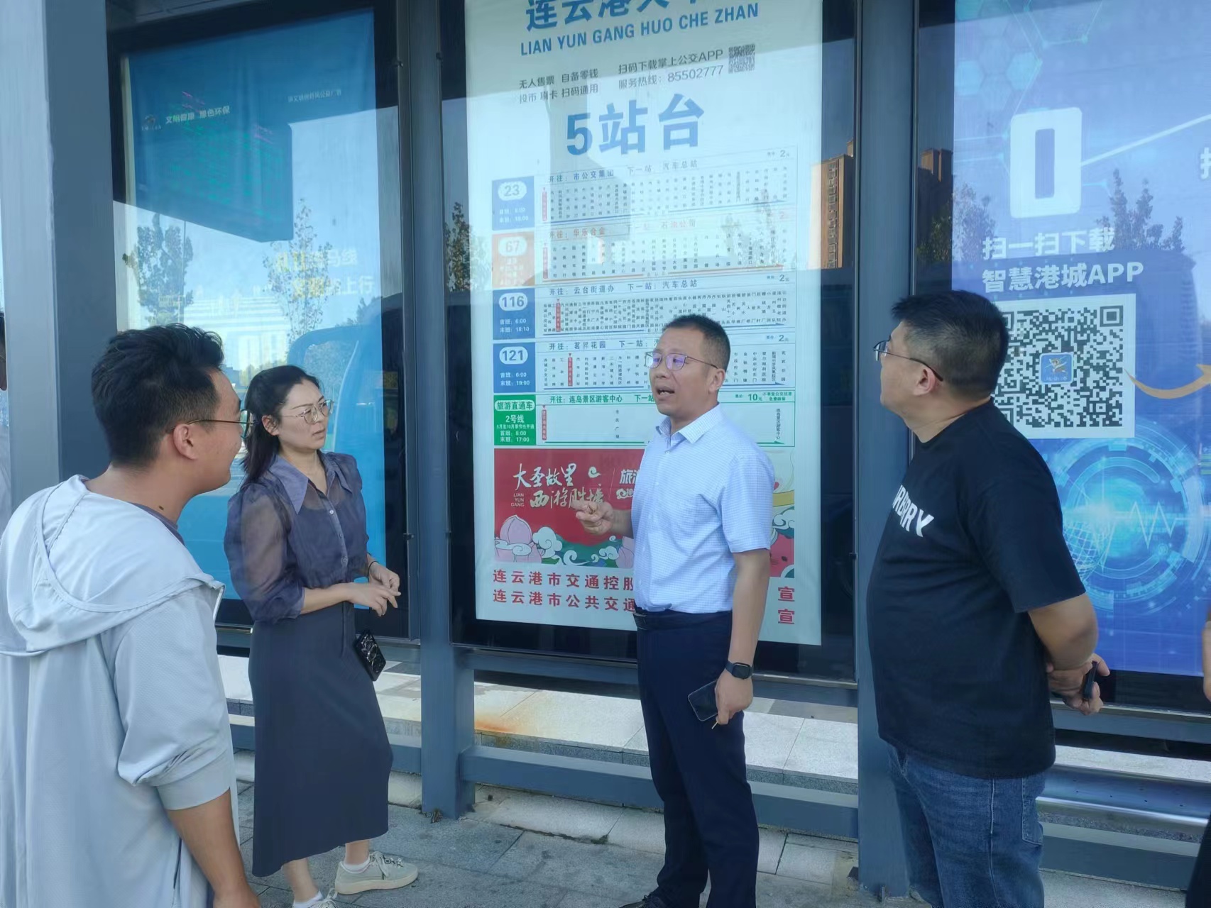 随着旅游季的到来,为了更好地为外地游客提供便捷准确的公交出行服务。824日,公司总经理陈琛、副总经理朱晓雯带领技术人员前往连云港火车站B区对电子站牌运行情况和准确率情况开展现场实际调研工作。