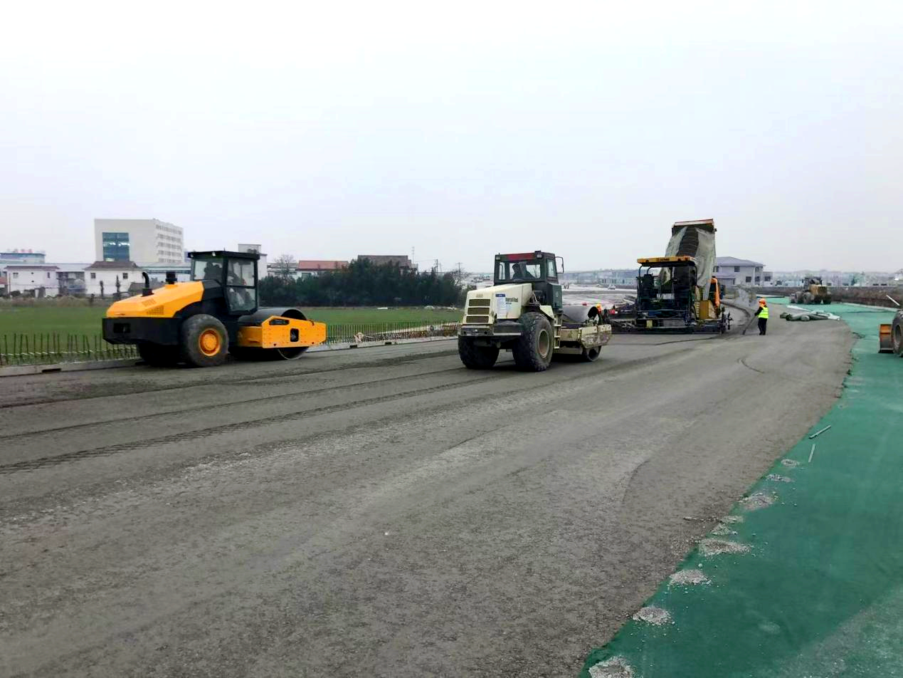 近日,江苏海建公司瀛洲南路改造及南延工程(一期)项目南互通节点水泥稳定土摊铺全部完成。