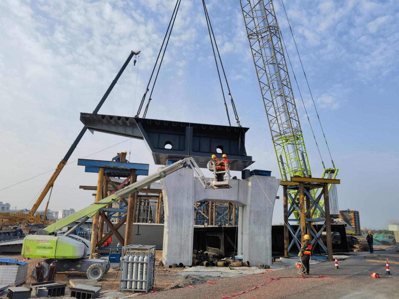 晨曦中,现场已是一片忙碌景象。作业人员各司其职,对吊装设备进行细致检查,确保各项性能达标。钢箱梁在绳索牵引下缓缓升空,平稳挪移,精准就位,测量小组全神贯注使用全站仪和水准仪捕捉每一丝位移、高度变化,实时汇报数据,保障吊装按预设轨迹精准前行。同时,安全、技术等多部门协同配合,严守各自“战线”,筑牢安全墙、把控工艺关。