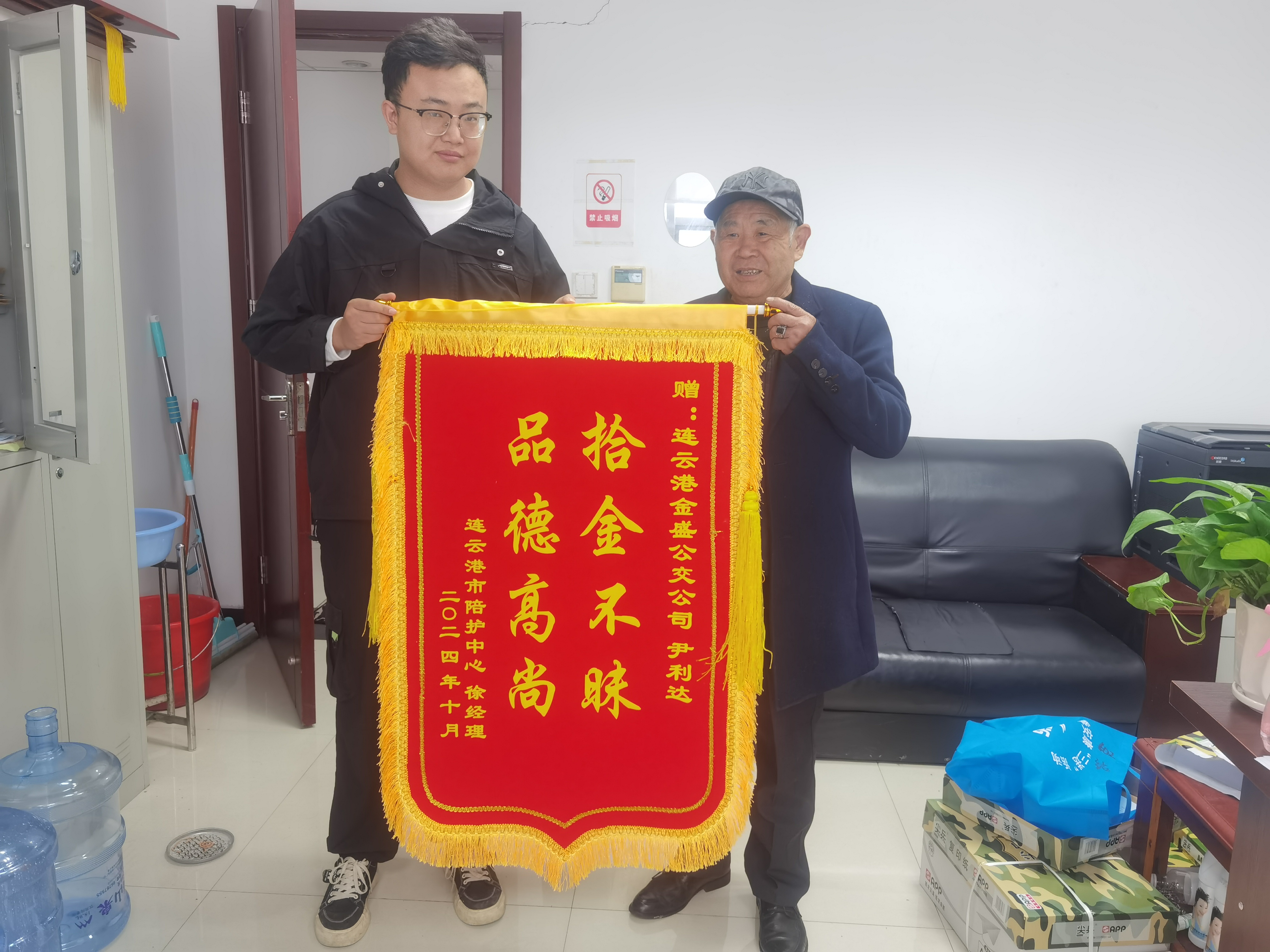 为了表达对尹利达师傅拾金不昧高尚品德的感谢,徐经理特意择日来到金盛公交公司,送上了一面写有“拾金不昧, 品德高尚”的锦旗。尹利达师傅拾金不昧的行为,不仅展现了公交驾驶员良好的职业素养,也为社会传递了一份正能量。