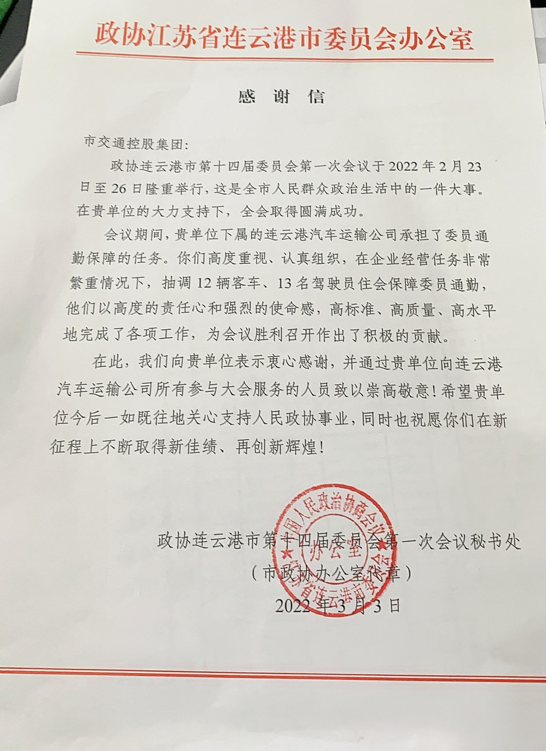 近日,从市交通控股安博app最新版下载,安博(中国)获悉,政协连云港市第十四届委员会第一次会议秘书处发来感谢信,对汽车公司在第十四届委员会第一次会议中的交通保障工作表示衷心感谢,对公司所有参与大会服务的人员致以崇高的敬意。