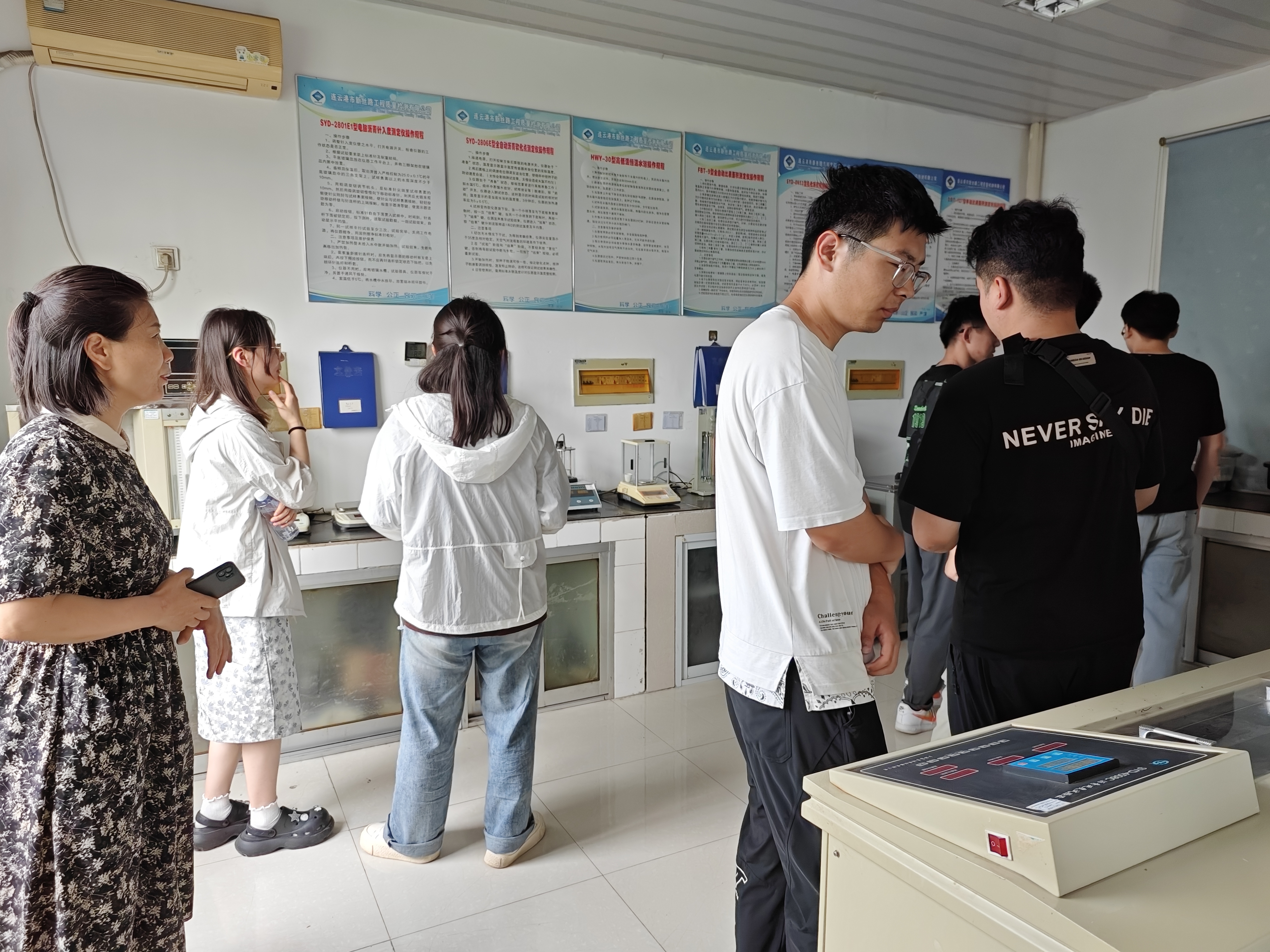 第二站来到新丝路检测公司,副经理唐雪雁带领新职工参观检测中心,同时对道路试验检测内容和安全操作规范进行详细讲解,加深新职工对道路检测现场及人员检测能力的直观认知,从而为高质量的道路建设工程提供坚实的技术支持。