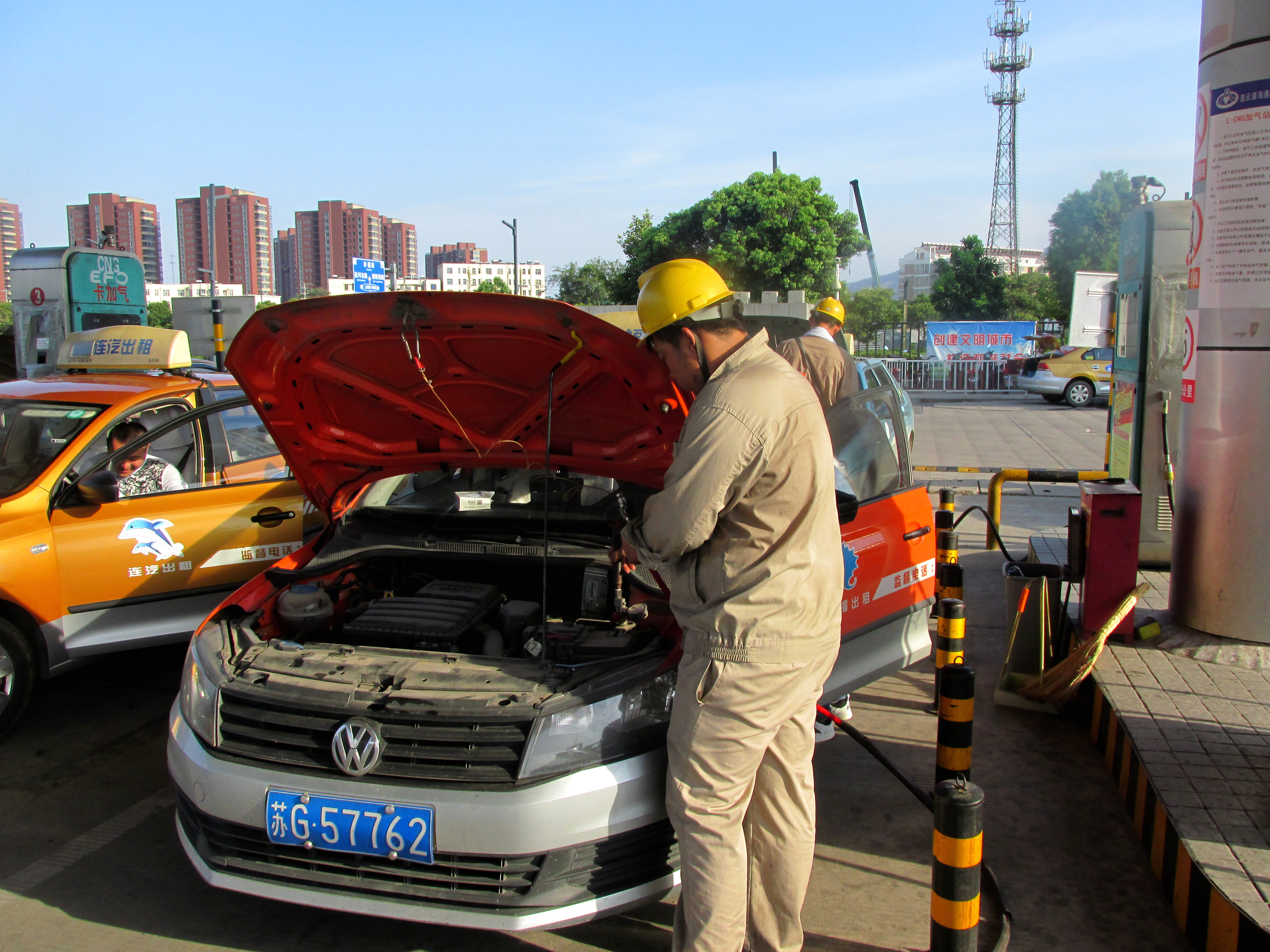 在CNG加气机旁工作的常锐是个腼腆的大男孩,引导出租车进站到指定加气位置,提醒司机打开前后舱、检查加气瓶、通上加气枪、挂上安全挂钩,这一套动作常锐再熟悉不过,但是每一次加气,他都没有一丝懈怠。“加气关系到安全,不能有一点马虎。”说话间,常锐把这台出租车的加气量和金额进行记录,他指着手背上凸起来几个包,“这是前两天我值晚班时候被蚊子叮的,这边的蚊子厉害得很。”
