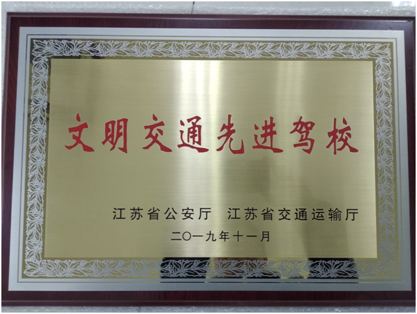 2019年11月,交培公司在文明交通“五个一”进驾校活动中,被江苏省公安厅、交通运输厅联合评为2019年度文明交通先进驾校。