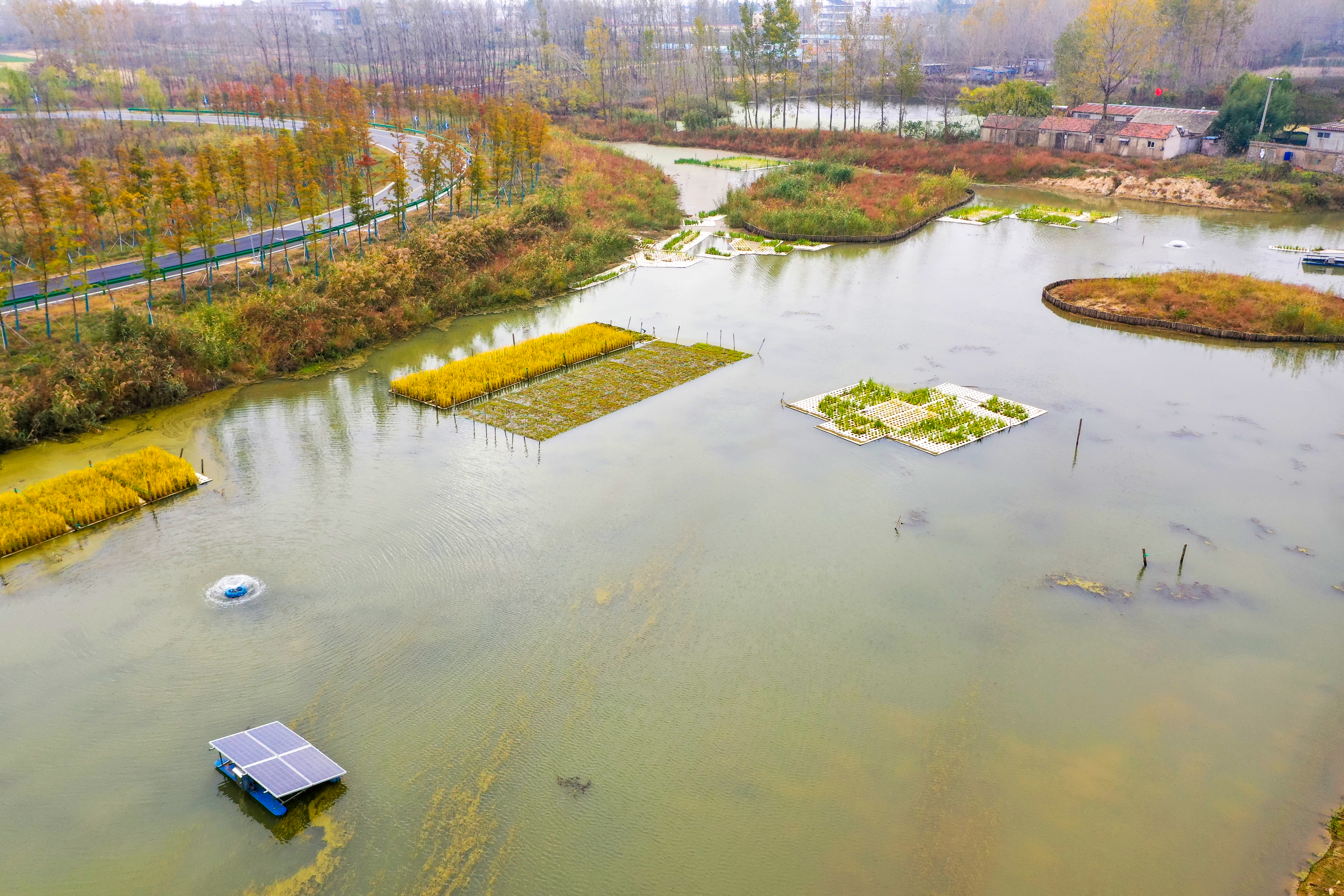 驻足水边,闻到的是清爽纯粹的大自然气息,看到的是生态多元的水治理模式:原本发黑的水体仅剩部分浮萍,水上漂浮着数片“试验田”,成熟金黄的水稻在水上轻柔摇曳,一幅“溯游从之,宛在水中央”的美景随风绽开。在三个月的试验后,稻穗饱满,水质改善,石梁河水库周边村庄“水上稻”种植试验获得圆满成功,即将收割。