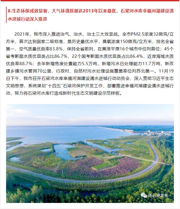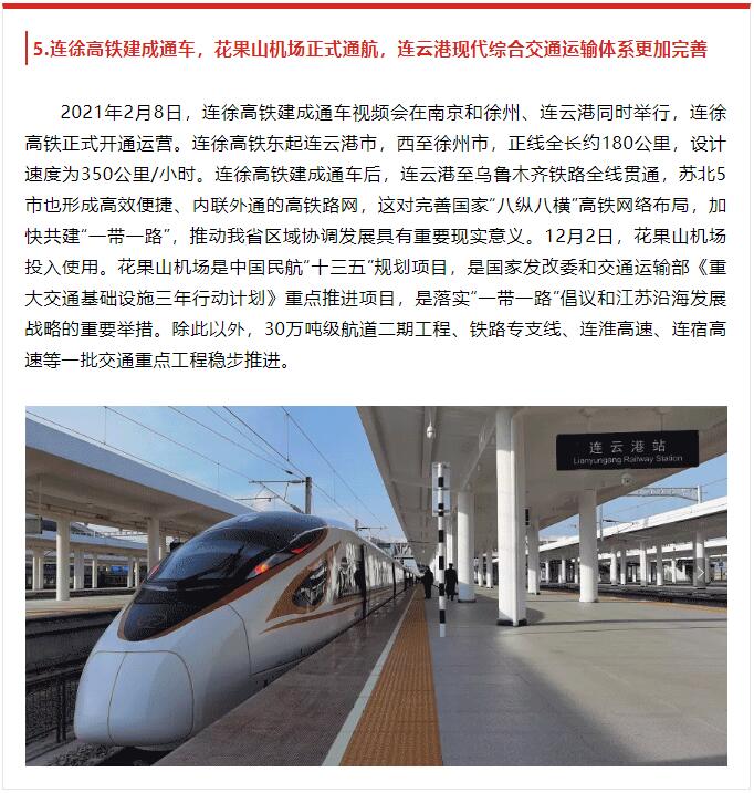 2月8日,由中共连云港市委宣传部主办,连云港报业传媒安博app最新版下载,安博(中国)、连云港广电传媒安博app最新版下载,安博(中国)承办的2021年度连云港市十大新闻评选揭晓,其中,第5条“连徐高铁建成通车,花果山机场正式通航,连云港现代综合交通运输体系更加完善”和第8条“生态环保成效显著,大气环境质量达2013年以来最优,石梁河水库幸福河湖建设清水进城行动深入推进”均与交通安博app最新版下载,安博(中国)相关。原文如下: