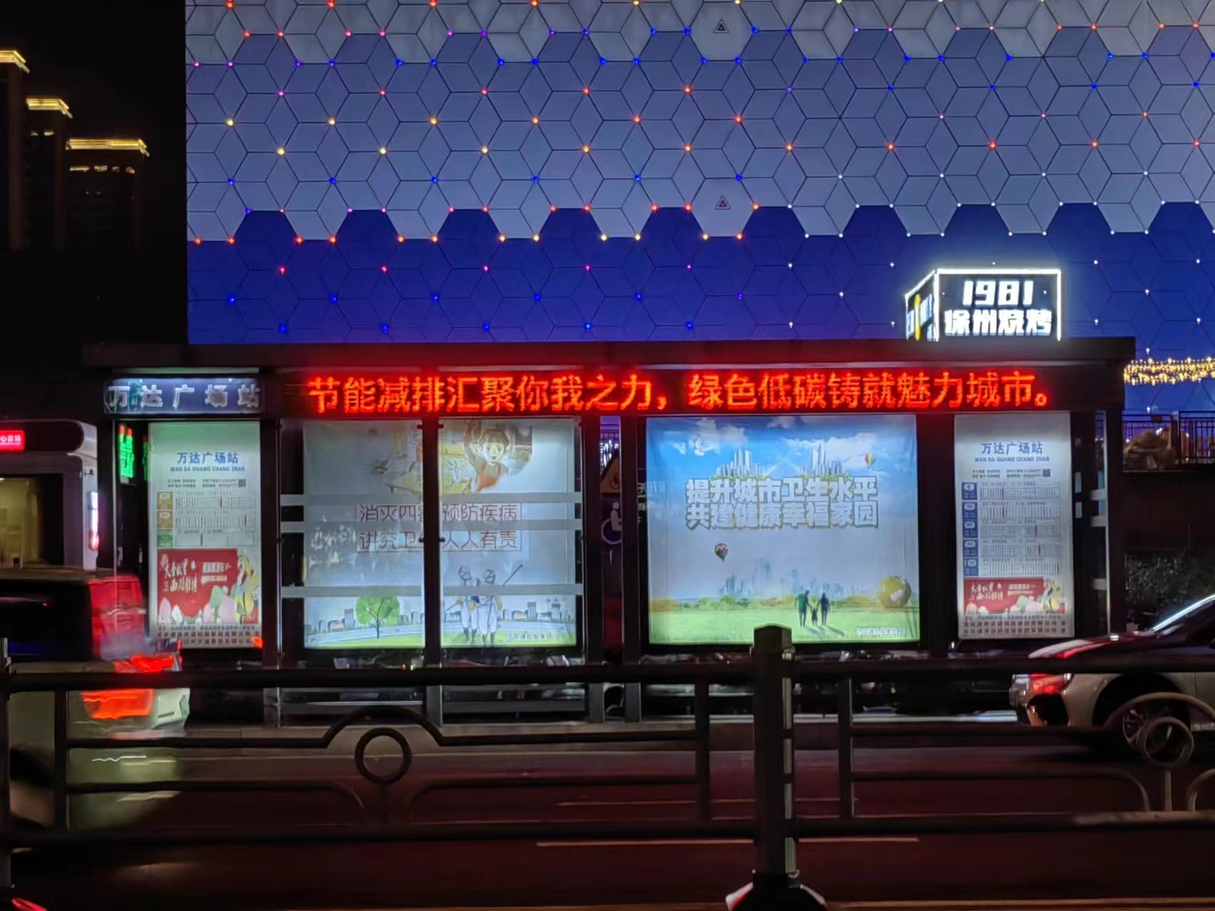 此次宣传工作以全市400余座常规公交站亭为阵地,充分利用了曝光度极高的公交站亭作为媒介,大大提高了宣传推广效率,保证了一定的受众群体基数。宣传以口号标语为主要载体,上刊于市区各主要道路的公交站亭LED条屏,标语内容为:“节能减排汇聚你我之力,绿色低碳铸就魅力城市”。