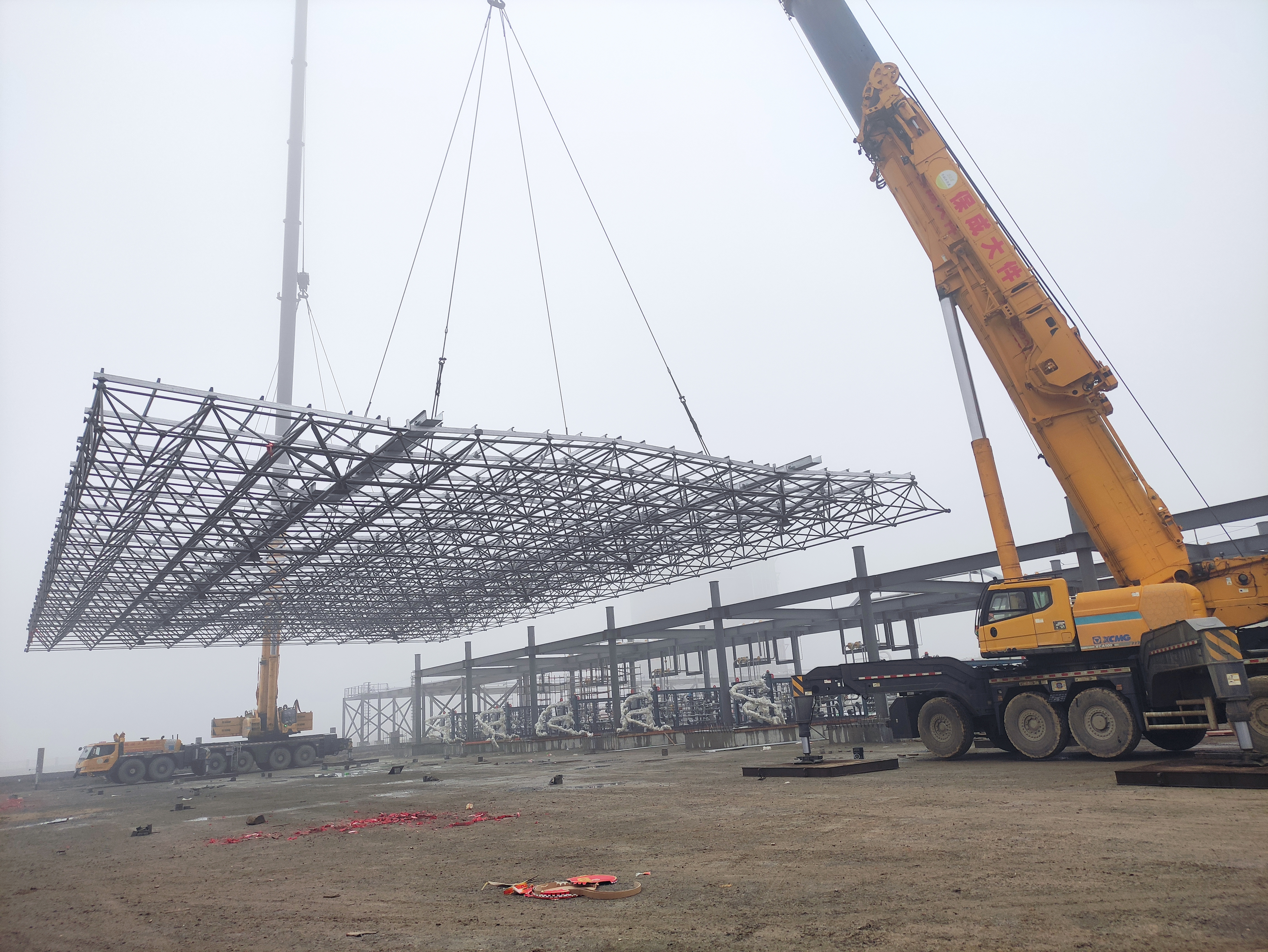 12月30日,物流安博app最新版下载,安博(中国)LNG储配站槽车装卸区钢结构网架精准落位,槽车装卸区钢结构吊装顺利完成,标志着影响工期关键节点的钢结构施工实现突破。