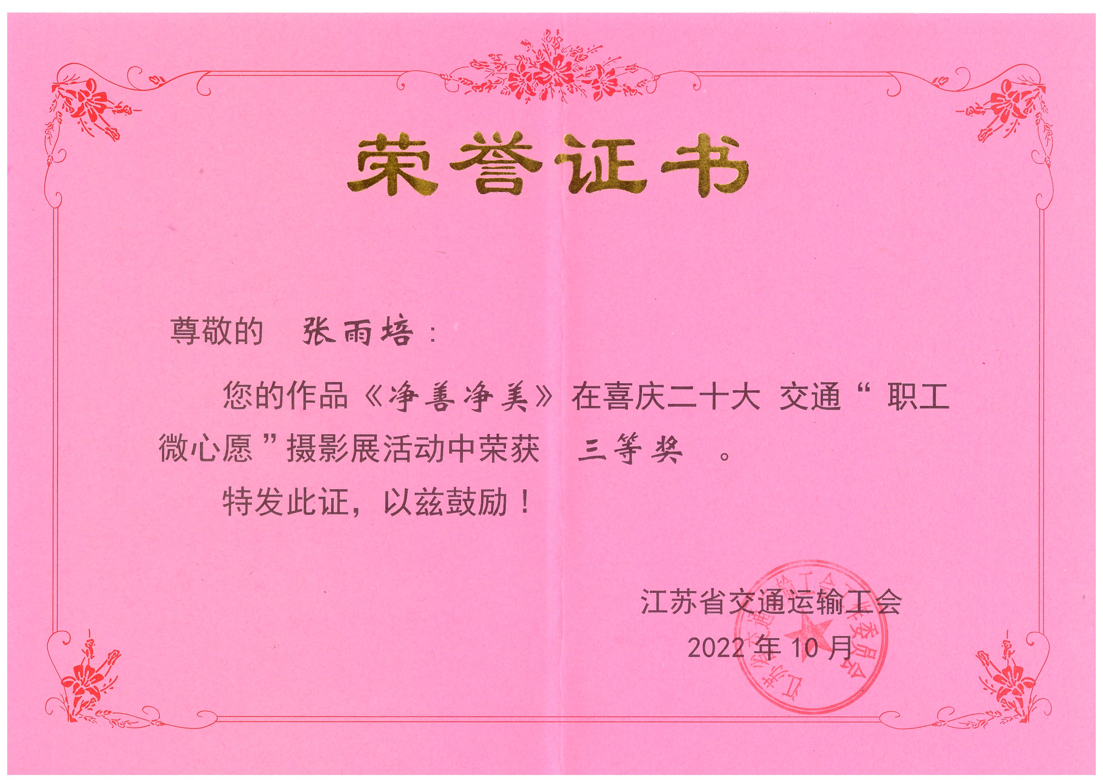 近日,从江苏省交通运输工会传来喜讯,连云港市公交安博app最新版下载,安博(中国)职工张雨培的摄影作品《净善净美》在喜庆二十大交通“职工微心愿”摄影展活动中荣获“三等奖”。