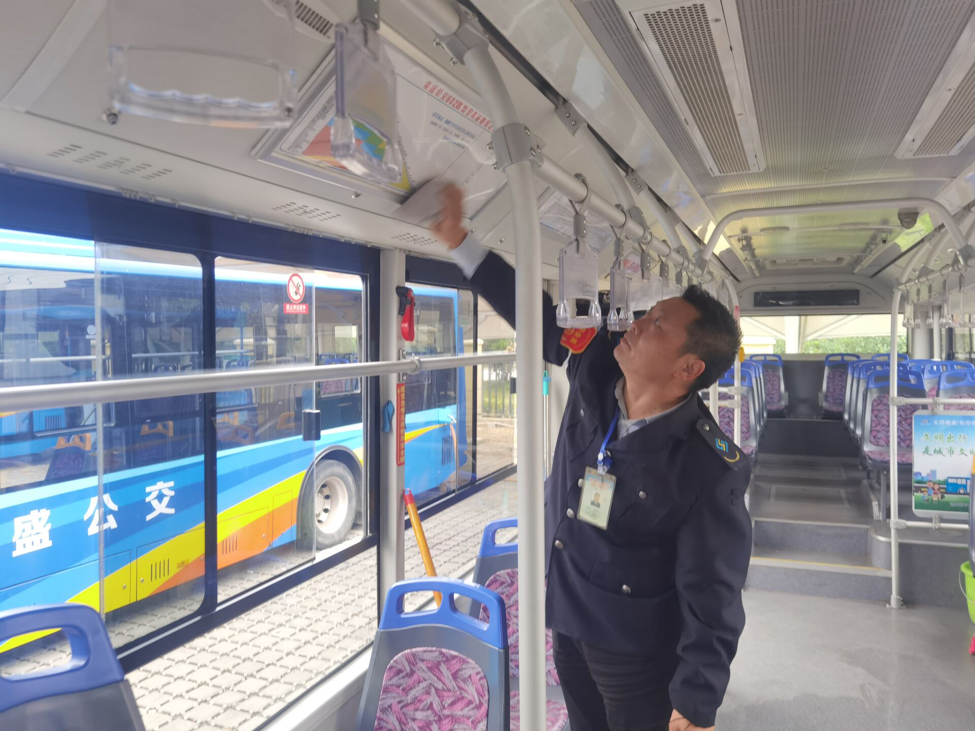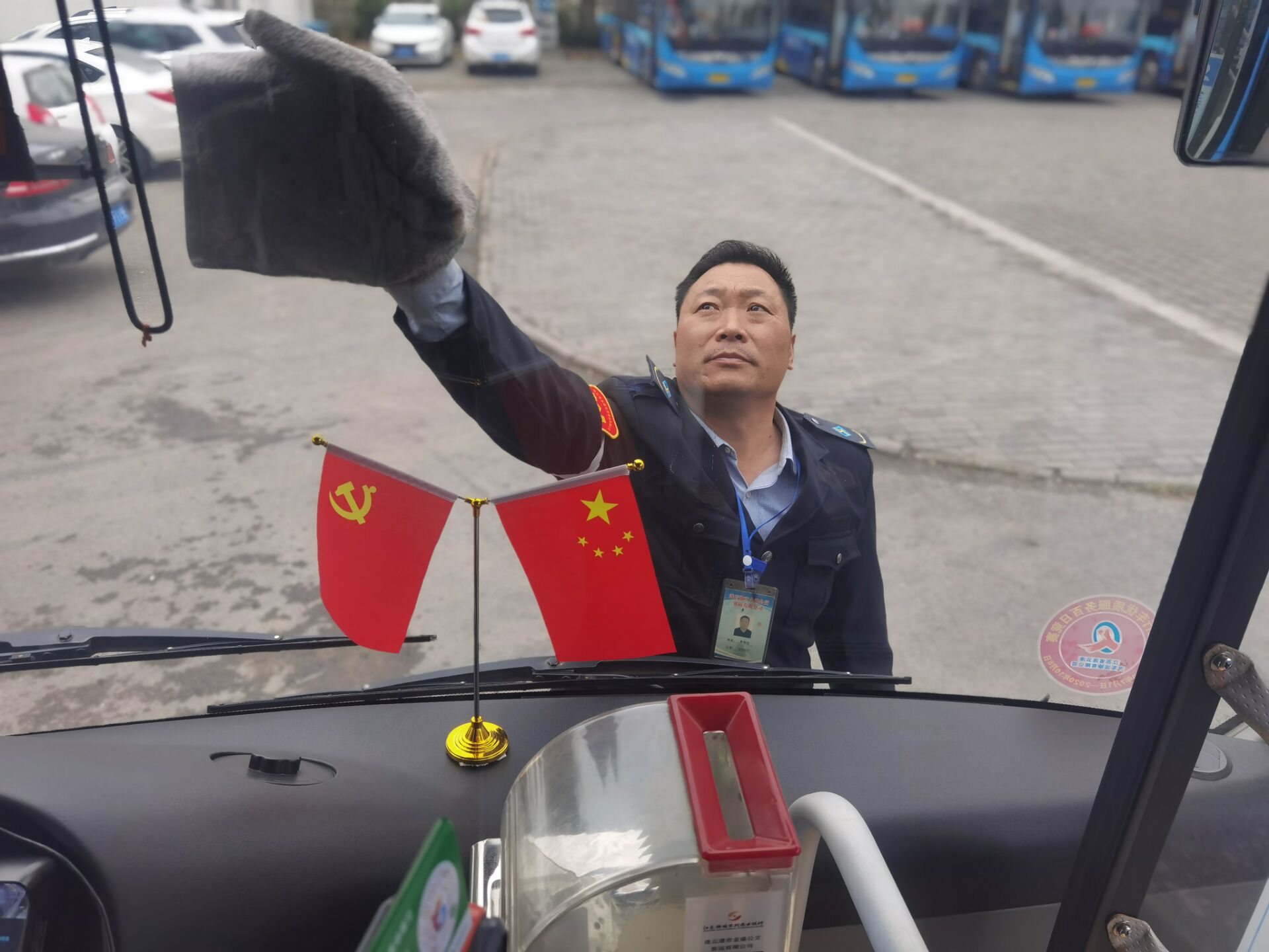 101日早上5点多,603路驾驶员樊耀声就已经来到公司,检查过车辆安全后,打上一瓶消毒液,把车厢内仔细消杀了一遍,打开了车里所有的窗户,再用抹布把车厢座椅及扶手抹上一遍。等一切工序做完后,樊耀声利用最后一点时间,急忙把从家里带来的煎饼啃上几口,便驱车驶入602路发车区,开始了一天忙碌的工作。当问到樊耀声,“别人放假了,休息了,陪着孩子出去玩了,您心里难受吗”?樊耀声摇摇头道:“假日里的公交车不能没有人开,市民的安全出行需要有人来保障,祖国的繁荣富强,百姓的安居乐业,需要我们公交人的坚守,才能让更多的市民过上一个祥和的节日,孩子会理解的。”