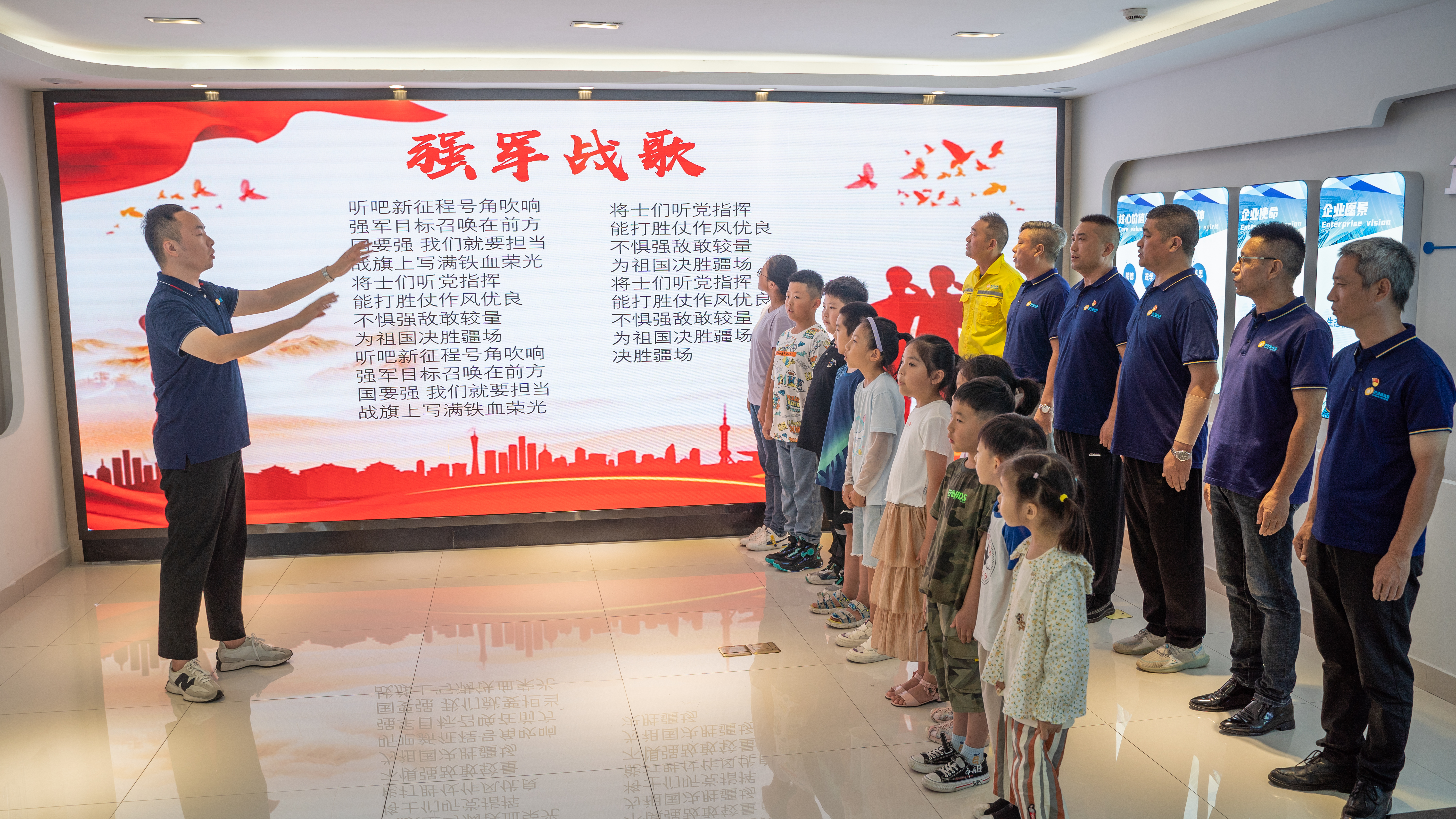 随后,退役军人带领公司职工子女唱军歌,孩子们积极参与,用心学习。他们用童稚的嗓音,唱出了对军人的敬仰之情。每一句歌词,都传递着深深的感激和崇高的敬意。接着,退役军人们教小朋友们站军姿,敬军礼,手把手纠正他们的动作。孩子们学得严肃认真,个个昂首挺胸、目光坚定,深切地体会到了军人的风姿、坚持与奉献。